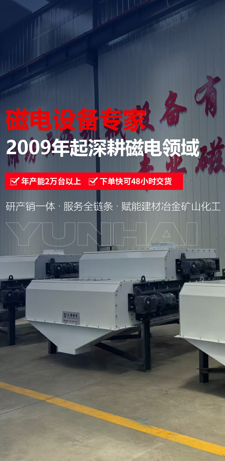 濰坊云海機械設(shè)備有限公司始建于2009年,是生產(chǎn)磁電機械設(shè)備的廠家。系生產(chǎn)建材、冶金、礦山、化工等行業(yè)微機自動化、檢測、控制專用設(shè)備的公司。主要產(chǎn)品工業(yè)自動化配料系統(tǒng)、電磁永磁除鐵器、永磁磁選機、電磁振動給料機、皮帶螺旋輸送機、電磁滾筒、破碎機、包裝機 、除塵器等系列產(chǎn)品。